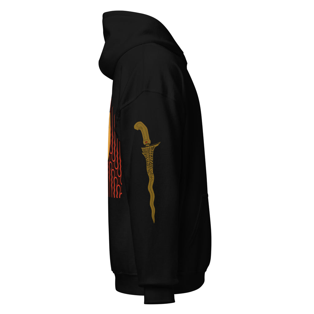 Amerindo V2 Hoodie includes Keris blade art on sleeves in bronze print.